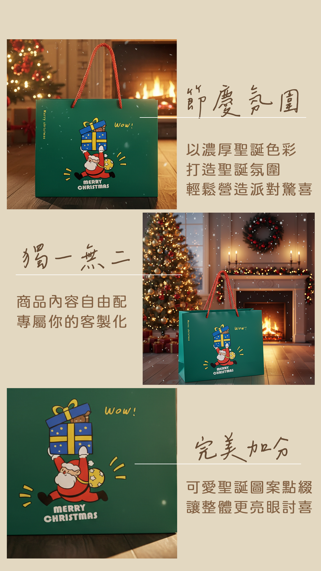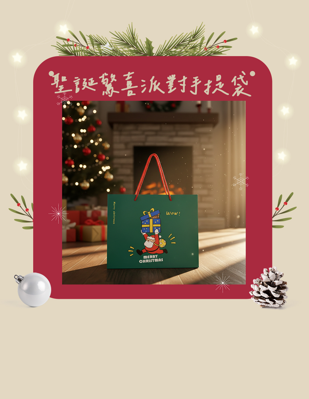 濃厚聖誕綠搭配俏皮聖誕老人插畫,節慶感滿滿,一眼就讓人感受到派對般的驚喜氛圍。