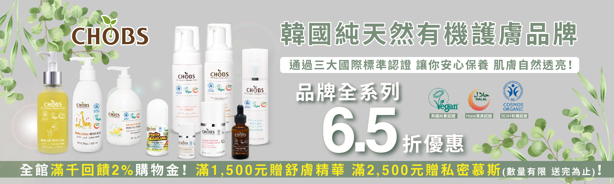 來自韓國的CHOBS為純天然有機護膚品牌,推出一系列Baby與家人都能使用的護膚品。堅持友善環境、友善動物理念,選用「天然有機原料」,通過三大國際標準認證,不含人工添加物,讓你安心保養,肌膚自然透亮!