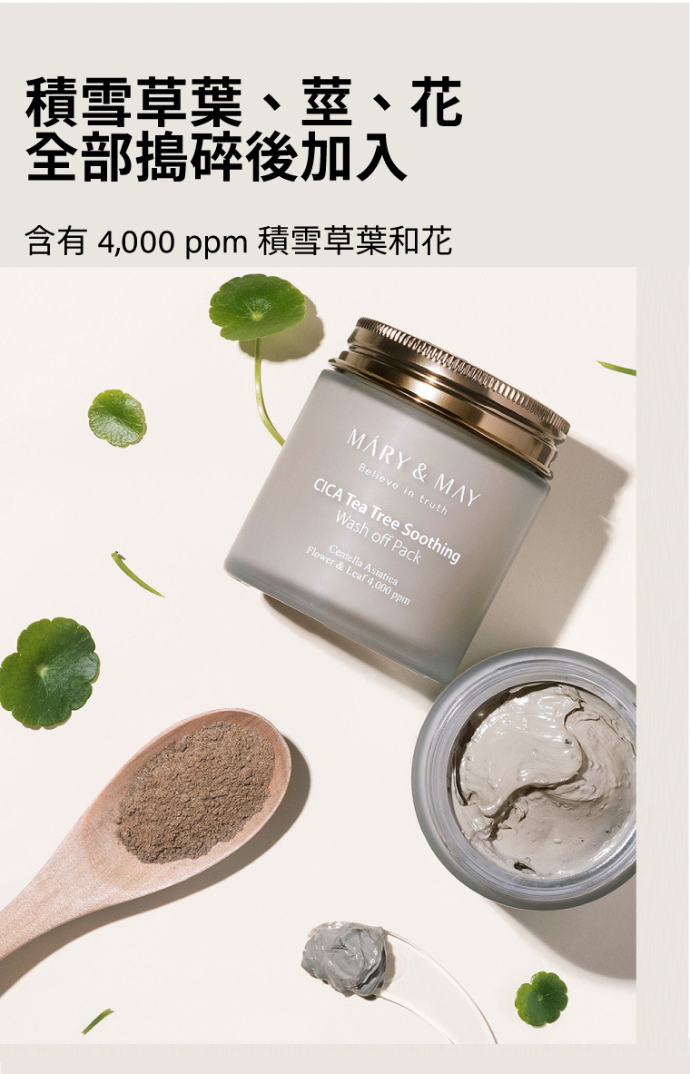 採摘完整的積雪草莖、花、葉,全部搗碎後加入面膜中