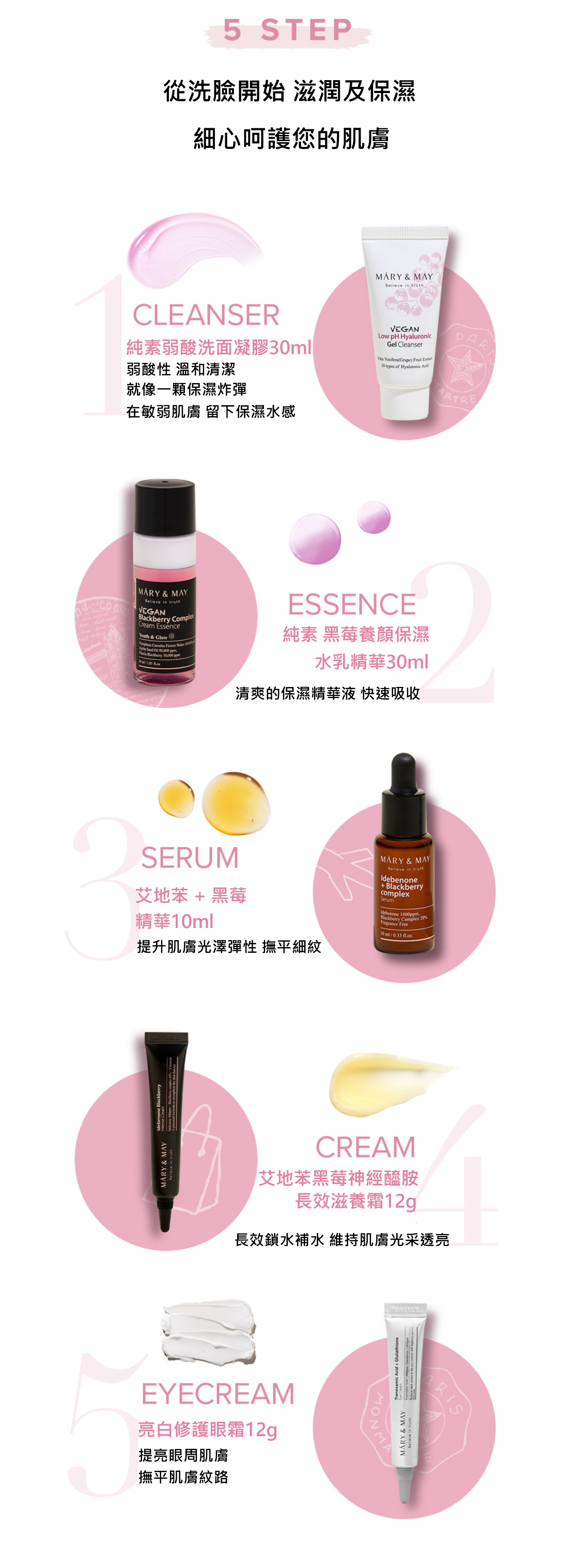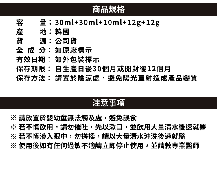 潔面凝膠30ml+化妝水30ml+精華液10ml+面霜12g+眼霜12g