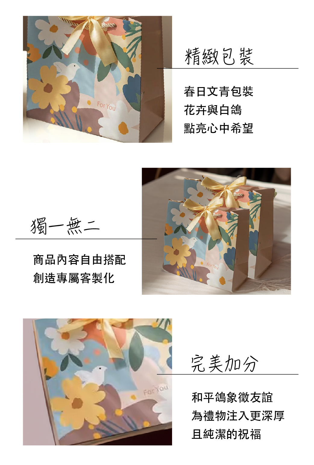 春日溫暖氣息的文青包裝,花卉、藍天與白鴿點亮著你我心中的希望。